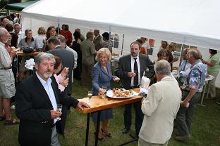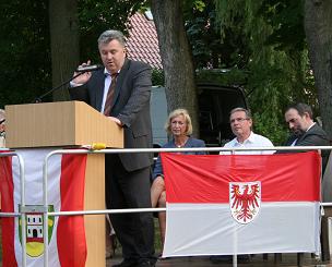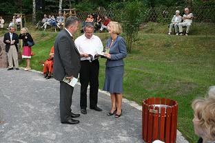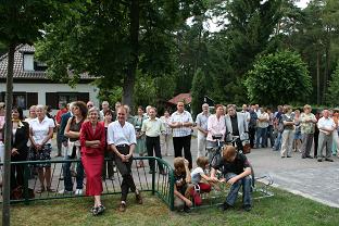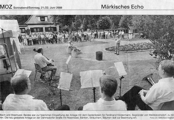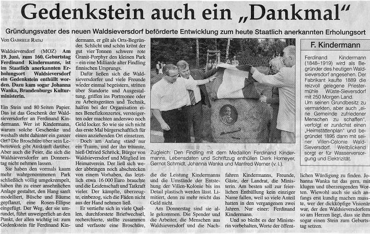 Es ist geschafft! Am Donnerstag, dem 19. Juni 2008, wurde das Denkmal für den Gründer des neueren Waldsieversdorf, Ferdinand Kindermann, anlässlich seines 160. Geburtstages feierlich eingeweiht. Nach 2-jähriger Vorbereitungszeit konnte die Schirmherrin des Denkmalsprojektes, die Ministerin für Wissenschaft, Forschung und Kultur des Landes Brandenburg, Frau Prof. Dr. Johanna Wanka gemeinsam mit Landrat Gernot Schmidt, MdL Dierk Homeyer und Bürgermeister Manfred Werner den Gedenkstein für Ferdinand Kindermann enthüllen. Geld - und Sachspender, die maßgeblich zum Gelingen dieses Vorhabens beigetragen haben, waren der Einladung gefolgt und erhielten für ihr Engagement die Schrift “Ferdinand Kindermann und die Villenkolonie Wüste-Sieversdorf/ Waldsieversdorf” als Geschenk überreicht. Neben zahlreichen Waldsieversdorfern und ihren Gästen waren auch einige Urenkel und eine Ur-, Ur - Enkelin von Ferdinand Kindermann bei der Einweihung anwesend.