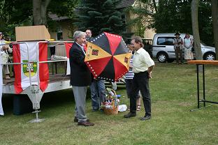“Knubbel”, Marko Ehmke, der gemeinsam mit Ferdinand Kindermann Geburtstag feiert, wird stellvertretend für alle fleißigen Helfer mit einem kleinen Präsentkorb ausgezeichnet, der auch eine Anspielung auf das abendliche EM-Spiel enthält