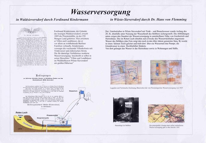 1927 wurde die von Ferdinand Kindermann gebaute Wasserversorgung nach 30 Jahren Laufzeit durch die Gemeinde Waldsieversdorf übernommen. Diese errichtete das Wasserwerk, das heute “Altes Wasserwerk” genannt wird, weil seine Aufgaben das neue Buckower Wasserwerk übernommen hat. (siehe auch unter “Wasserturm”)